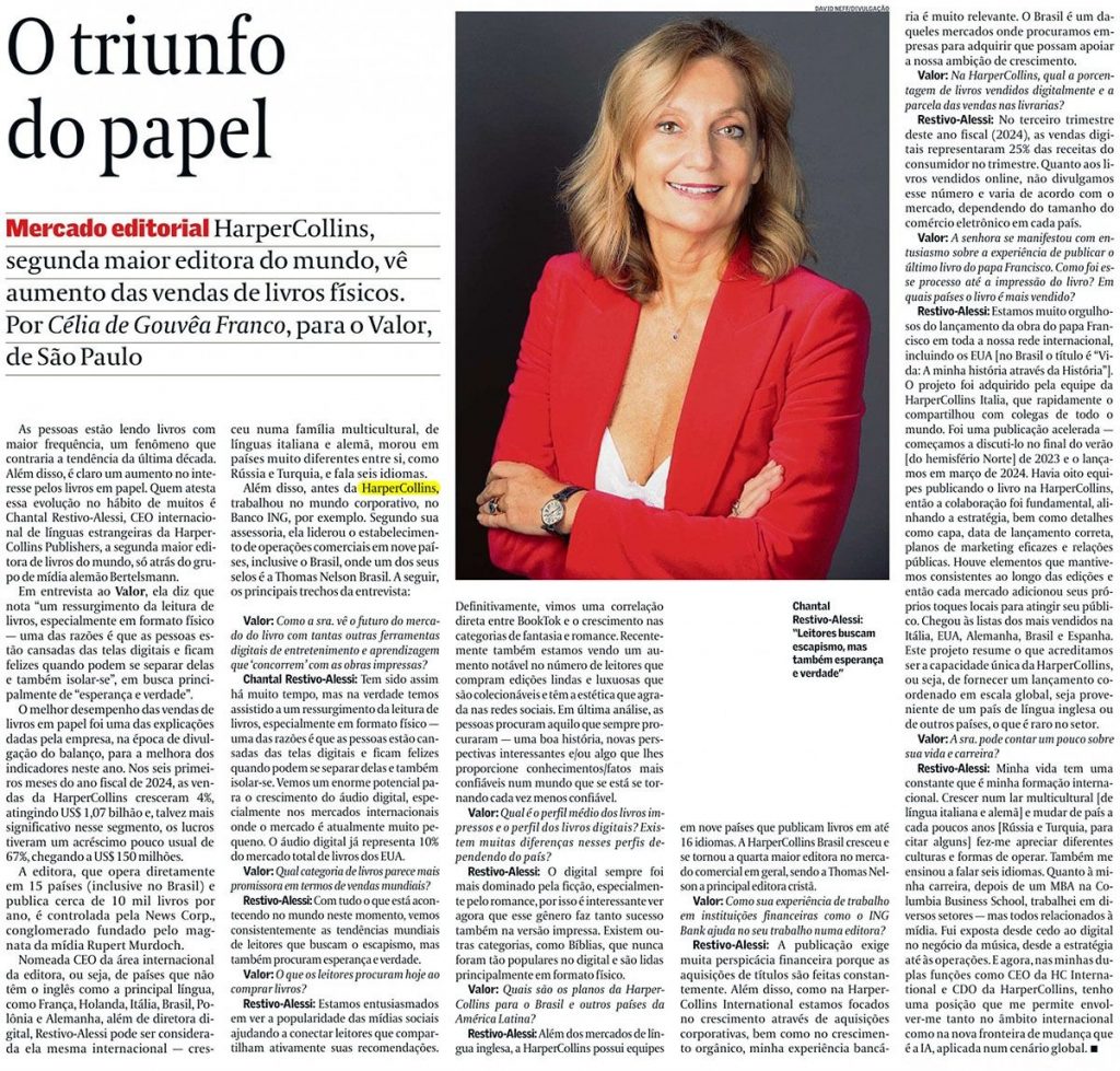 Em entrevista para o jornal, a CEO internacional de línguas estrangeiras da HarperCollins Publishers Chantal Restivo-Alessi falou sobre o ressurgimento da leitura de livros físicos dentro do mercado editorial.