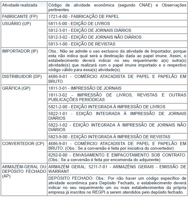 065A / 2024 – REGISTRO DE PAPEL IMUNE – CÓDIGOS CNAE COMPATÍVEIS