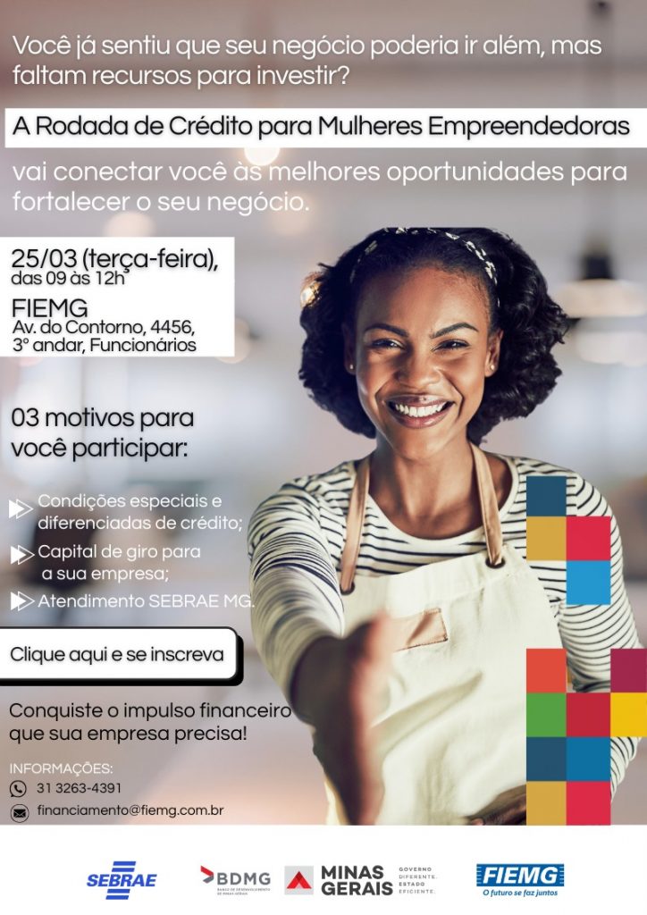 ✳️ O evento faz parte da campanha especial do BDMG para o Mês das Mulheres, que oferece condições diferenciadas de financiamento para micro e pequenas empresas lideradas por mulheres, por meio do Correspondente Bancário BDMG/FIEMG. Além do crédito, as participantes também terão acesso a capacitação técnica oferecida pelo Sebrae.